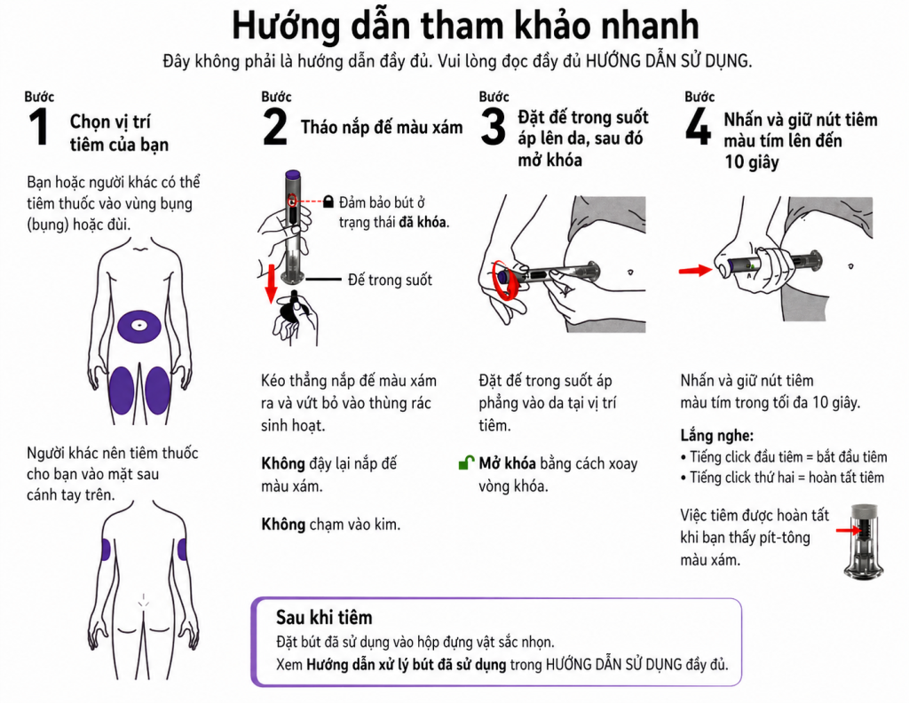 - Hướng dẫn tiêm tại nhà: Bút tiêm được thiết kế dạng dùng một lần, tiêm dưới da vùng bụng, đùi hoặc bắp tay một cách dễ dàng và không gây đau.